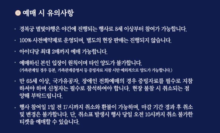 * 현장에서 증빙서류(장애인 복지카드, 국가유공자증 등)를 지참하지 않거나 할인기준과 다른 경우 별빛야행의 참가가 취소 조치되며, 별도의 환불이 불가함을 알려드립니다.