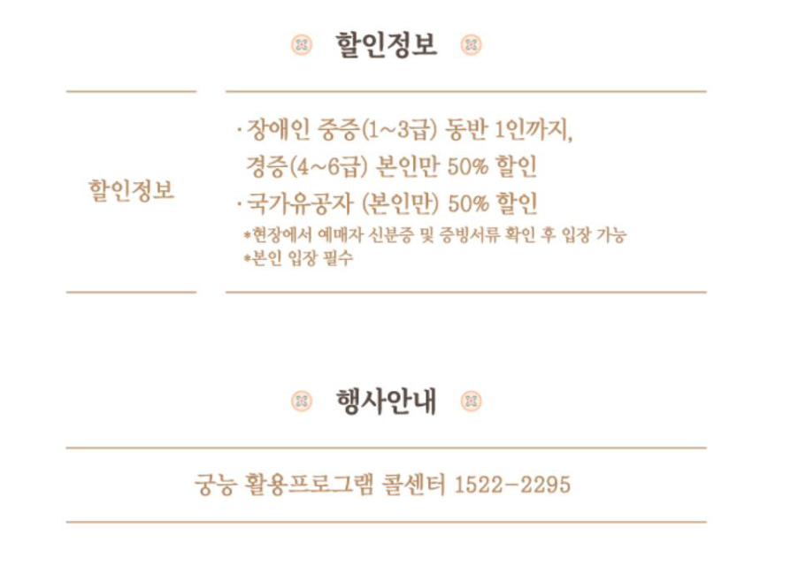 - 장애인 중증(1~3급) 본인 포함 2인 50% 할인/ 장애인 경증(4급 이하), 국가유공자 본인 한정 50% 할인