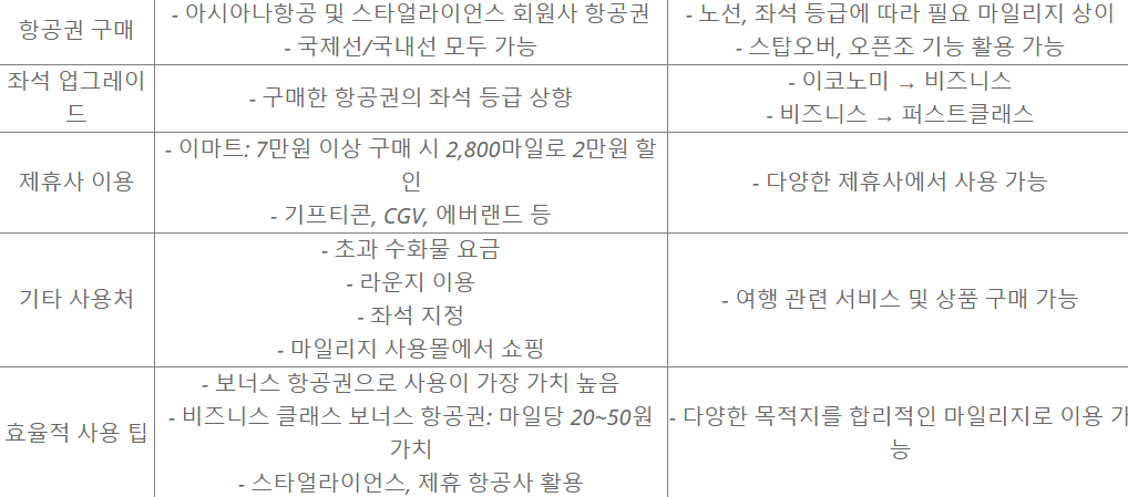- 제휴 서비스 이용: 아시아나 마일리지는 항공사뿐만 아니라 호텔 숙박, 렌터카, 면세품 구매 등 다양한 제휴 서비스에 사용할 수 있습니다. 제휴사 목록을 확인하고 적절히 사용해 보세요.