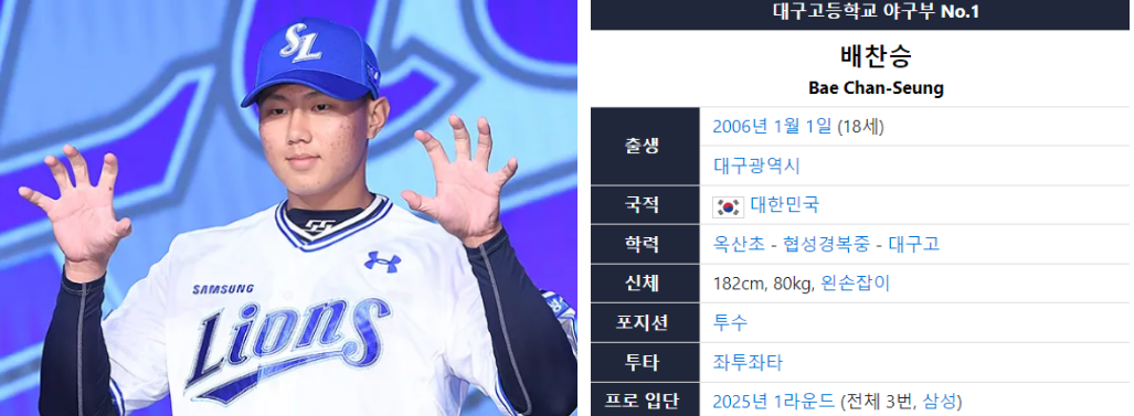 삼성 라이온즈가 3순위로 선택한 좌완 투수입니다. 삼성은 이미 강력한 투수진을 보유하고 있지만, 배찬승의 추가로 더욱 탄탄한 로테이션을 구축할 수 있을 것으로 보입니다.